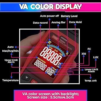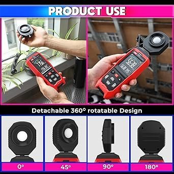 - Multifunctional: With 5-digit colorful display foot candle light meter can measure temperature (C/F) with MAX/ MIN/ AVG Reading. Also equipped with Data Hold, Auto-Power off (15min) feature.
