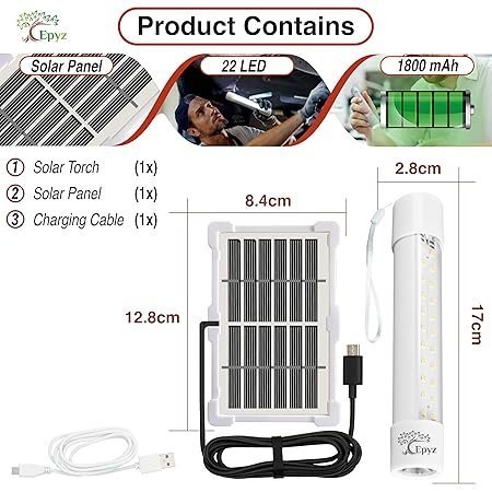 • Package contains – 1 pc of Rechargeable Solar LED Tube Light, pair of Magnetic clamps, Electric charger & 5 volts 1 Watts Solar Panel with 3 meters long cable.